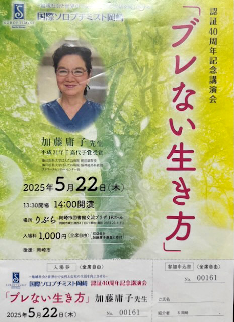 国際ソロプチミスト岡崎認証40周年記念講演会を5月22日に開催致しました。実はこの脳外科医加藤庸子講演会は2020年に開催予定でしたが、コロナ感染症による緊急事態宣言のため断念していました。今回の開催は5年間待ち望まれていました。