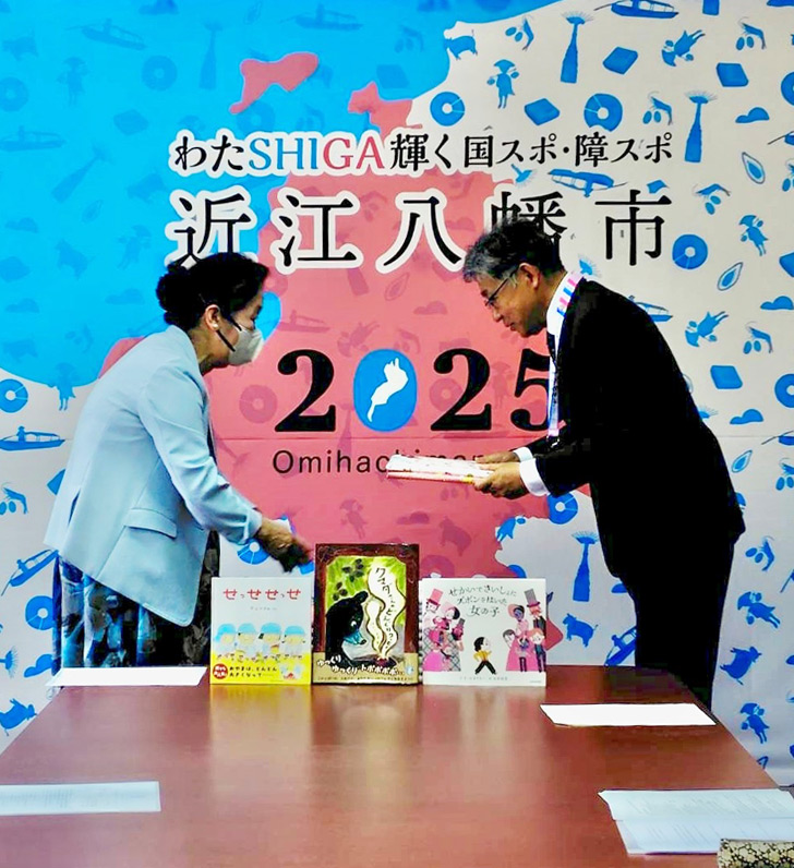 未来を担う子供たちの健やかな成長を願い、毎年絵本の贈呈を行っております。 今年度は、令和7年5月20日に、近江八幡市役所市長室において、贈呈式が行われました。 今年で18年目、贈呈した絵本は、延べ、1238冊になりました。 贈呈絵本の一冊は、近江八幡在住の「はやしますみ」さんの「クマダさんのどんぐりコーヒー」です。 子どもたちの心の成長と感性を育むことを願っております。