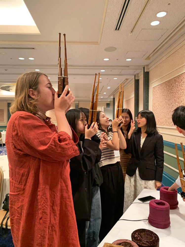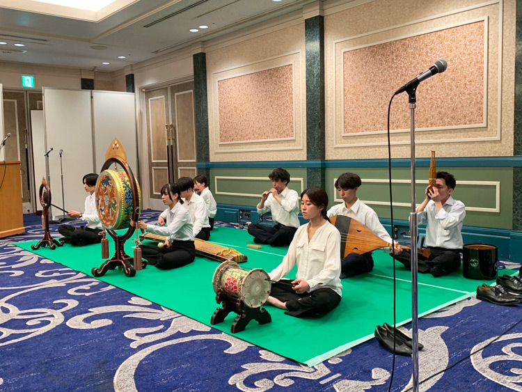 6月7日(土)、ホテル日航奈良で「留学生交流会」を開催しました。当クラブが長年支援している天理大学雅楽部Σソサエティの皆さんに講師を依頼、奈良県内の留学生をお招きし、日本の伝統文化・雅楽に関するミニレクチャー、生演奏のあと、笙(しょう)や篳篥(ひちりき)などの楽器の演奏の体験をしていただきました。参加したのは13か国(中国、ミャンマー、香港、モロッコ、韓国、ロシア、インドネシア、モンゴル、フランス、ブラジル、コロンビア、ポーランド、アイルランド)からの留学生22人。当クラブではこれまでも「留学生交流会」を行ってきましたが、これほど多くの国からの留学生が参加したのは初のこと。国際色豊かで笑顔あふれるひとときとなりました。