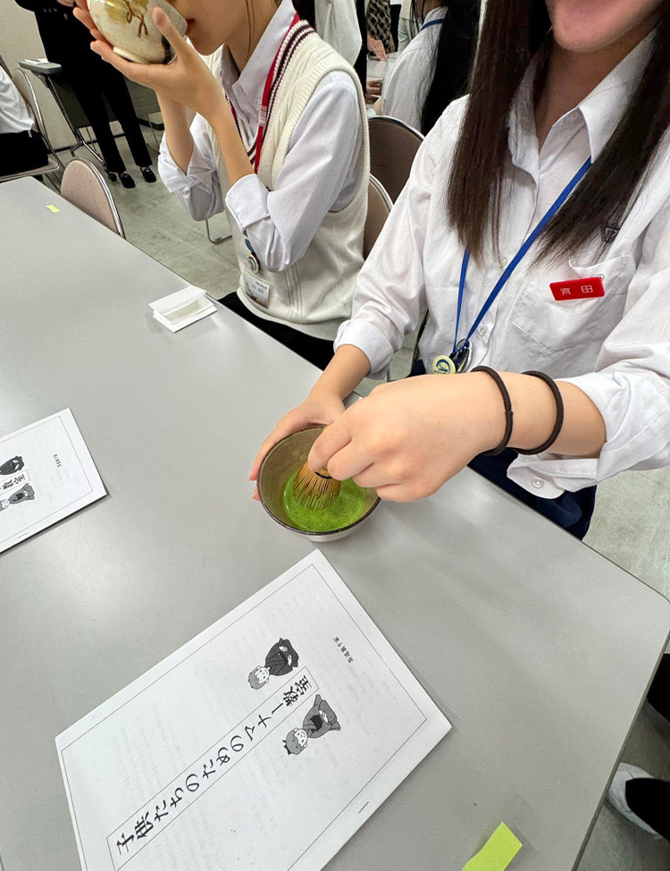 17名の学生が参加し、裏千家師範を持つ会員がお点前を披露しました。お菓子を食べた後は実際にお抹茶を点て飲む体験もし、心豊かな体験となりました。