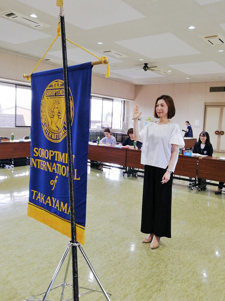 荒川会員より紹介と推薦の言葉があり、高桑会長の歓迎の辞、会員ピンの説明をさて、授与されました。(5月15日に行われたオリエンテーションでソロプチミスト資料を贈呈してありましたので)引き続き新入会員の宣誓 新入会員として挨拶をして頂きました。