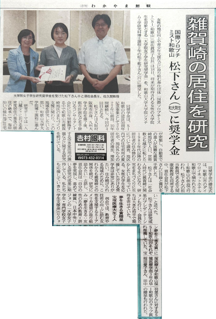 「国際ソロプチミスト和歌山 大学院女子学生研究奨学金」贈呈