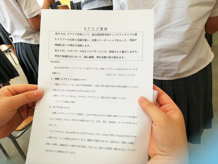顧問の永瀬先生より支援へのお礼の言葉があり、最後にSクラブ全員で、Sクラブ誓約を唱和しました。