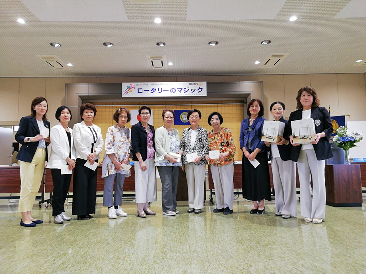 その後、一人一人の新入会員の名前の読み上げと、会員ピンの授与を行い、ウィンドアンサンブル部部長の窪田連さんに、支援金5万円の贈呈をしました。