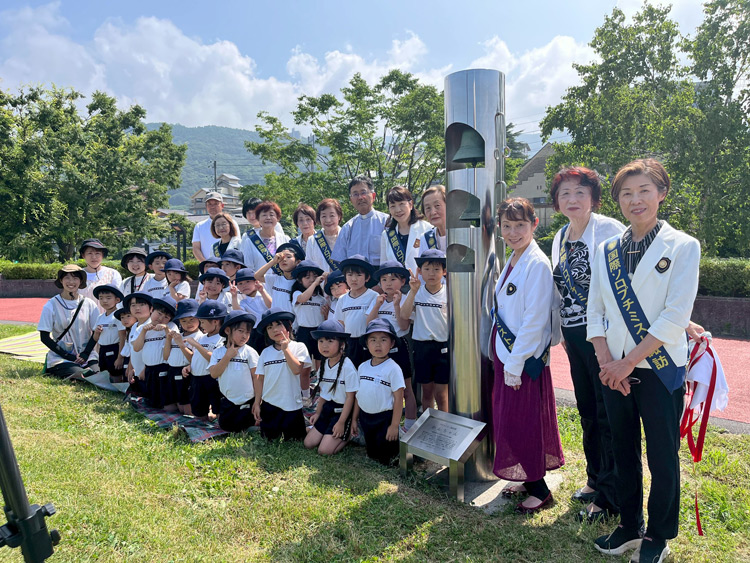 1991年に湖畔へナナカマド115本を植樹した記念の標柱「プチカリヨン」を湖畔に建立いたしました。2012年湖畔道路整備のため、諏訪市のご配慮で湖畔のメインの場所へ移築してくださいました。2023年11月に、国際ソロプチミスト諏訪の活動のPRとカリヨンが「諏訪湖浄化、世界平和を願う鐘」としての位置づけとして愛称をハガキ、オンラインを使い広く募集した結果、長野県内外からの応募で121件の応募があり、ウクライナ戦争の最中でしたので、皆世界平和を願うものばかりでした。信大名誉教授の沖野外輝夫先生に選考委員長をお願いして、その中から最優秀賞にすわせいぼ幼稚園児の皆さんが名付け親の「かんちゃん」に決定して2024年3月にメデイアを通して発表いたしました。選考理由は「カンカンとなるから」という未来を背負う子供たちの感性といたしました。他に優秀賞には秋田市からの「アイオン」、静岡県からの「湖輪」、団体賞、会長賞も選びそれぞれ記念盾と副賞をさしあげました。認証40周年記念事業として由緒も記した看板「ネームプレート」を設置したい旨諏訪市のご許可を頂き2025年7月10日に、すわせいぼ幼稚園児22名、関係者ご臨席のもと除幕式の運びとなりました。当日はソロプチミスト日和となり、暑い中でしたので園児のことも考えて、朝短時間で充実したセレモニーにいたしました。園児、会員が交互に「かんちゃん」を鳴らして、諏訪湖から世界平和を祈りました。テレビ、メデイアにも大きく取り上げて頂き、私達の知名度UPにもつながり、多くの方々のご協力で最初の認証40周年記念事業となりました。