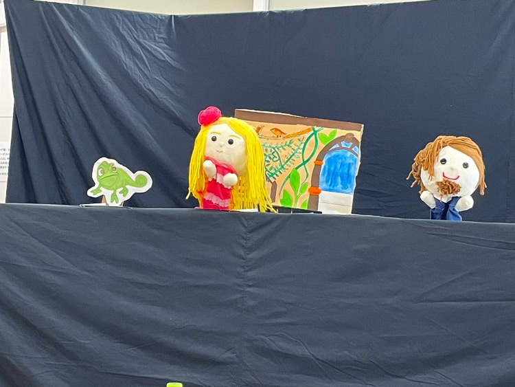 活動の中心となる人形劇や指遊びの人形、絵の校正、舞台装置、脚本、演出など全て学生の手作りです。当日は1年生による ラ・プンツェル、インサイドヘッドの2作品を楽しく鑑賞しました。幼稚園、保育園、教会、三重県大台町への夏合宿を兼ねた出前人形劇は、小さな子ども達が毎年楽しみに待っているそうです。