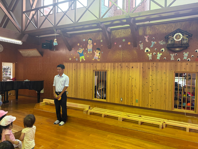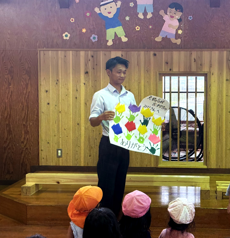 宮津天橋高校建築研究部の生徒達が空き時間や夏休みに制作した木製「小型平均台 8台、大型平均台 1台」をこどもの森保育園に寄贈した。簡単な贈呈式ではあったが、園児から生徒に感謝のプレゼントもあり、終始笑顔の絶えない式となった。