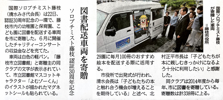 2014年から藤枝市立図書館への、大型絵本、紙芝居の寄贈を続け、その絵本などを、藤枝市内の幼稚園、保育園、こども園に配送するのに役立てていただこうと考えています。北村正平藤枝市長からは、「配送車があると、便利で助かる。格別の贈り物だ。子どもたちが絵本に慣れ親しむきっかけになればいい」と、お礼の言葉を頂戴しました。
