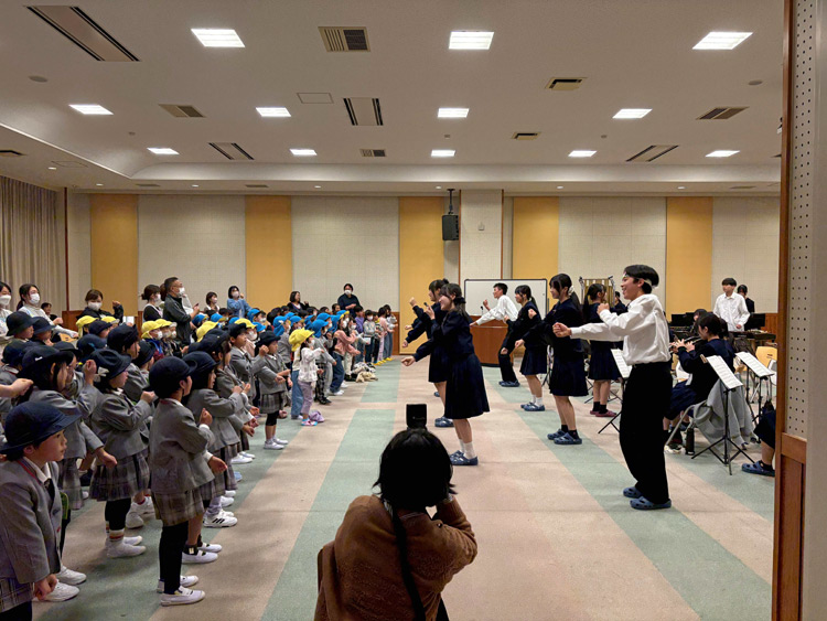演奏会は司会2名の元気いっぱいの進行で進められ、楽器の紹介を兼ねたブラス演奏、趣向をこらした桃太郎の寸劇、ディズニーランド人気曲を披露しました。園児たちは拍手をしたり、大声で歌ったりして楽しんでいました。