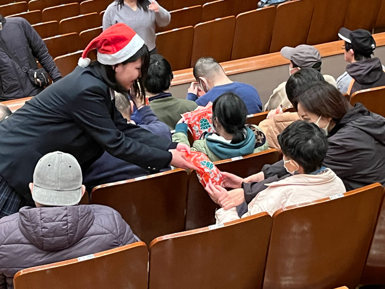 会場は、クリスマスソングのリズムにのって手拍子で盛り上がり、トーンチャイムで奏でられたやさしい音色にも包まれました。福祉施設の方からは、「毎年とても楽しみにしている」と、嬉しい言葉が聞かれ、会の終わりには、生活科学部が用意してくれたプレゼントをいただきました。寒い年の瀬に、温かい時間をみんなで過ごしました。