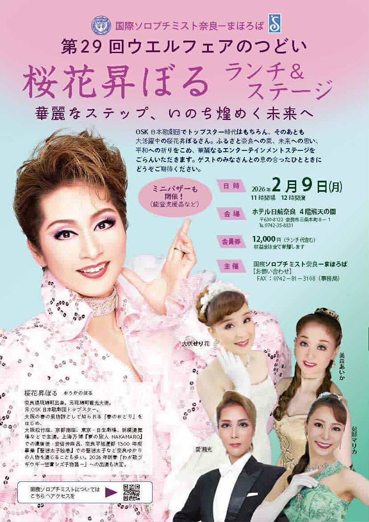 2026年2月9日(月)11時開場、12時開演。会場はホテル日航奈良 4階飛天の間で会員券は12,000円(ランチ代含む)です。収益金は全て寄贈します。なお、能登支援品などを販売するミニバザーも同時開催します。