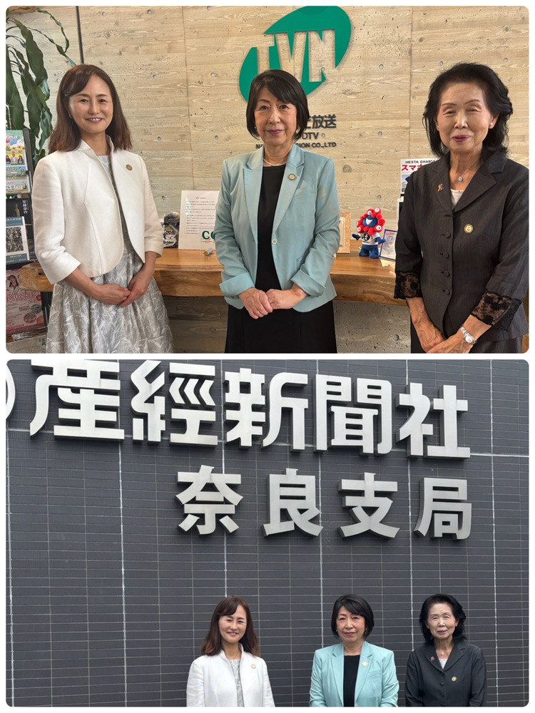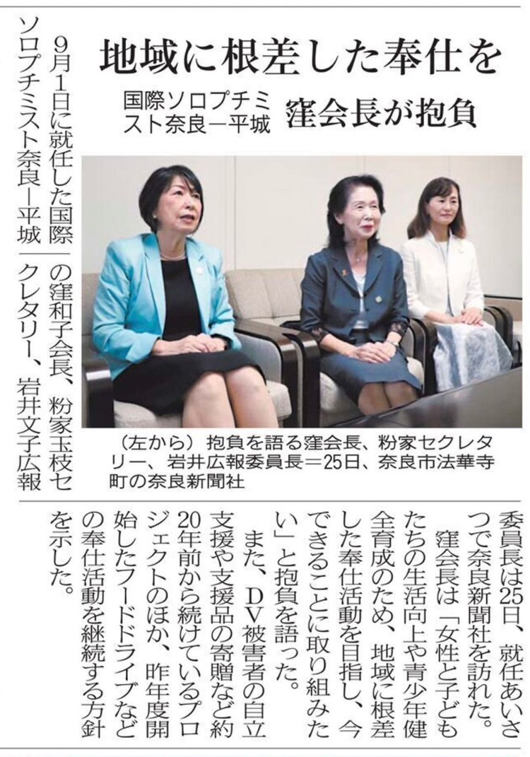 9月19日奈良市長、大和郡山市長、9月25日奈良新聞社、産経新聞社、奈良テレビ放送局の表敬訪問をさせて頂きました。 今期のテーマ『今できること 繋ごう奉仕の輪』〜支えよう女性と女児の未来のため、そして環境〜について当クラブの決意、活動方針を述べさせて頂きました。 また、奈良市、大和郡山市の現状もお聞きする事が出来大変有意義な時間でした。
