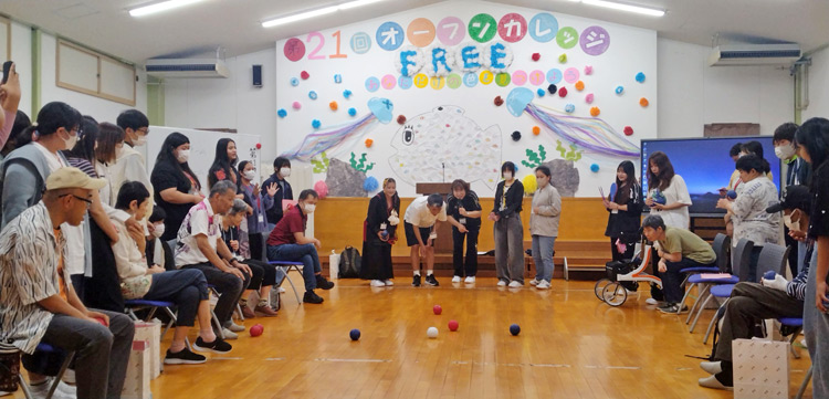 今回のオープンカレッジテーマ「♪FREE♪あなただけの色をみつけよう」のもと「ぼっちゃ」「多肉植物の寄せ植え」「ステンドグラス作り」「石鹸作り」を傷害のある方、学生達、先生方が一丸となって協力し合い、また、自国の民族衣装や言葉を紹介するブースありと盛りだくさんな内容で、一人一人が生き生きと楽しみながら学んでいらっしゃいました。