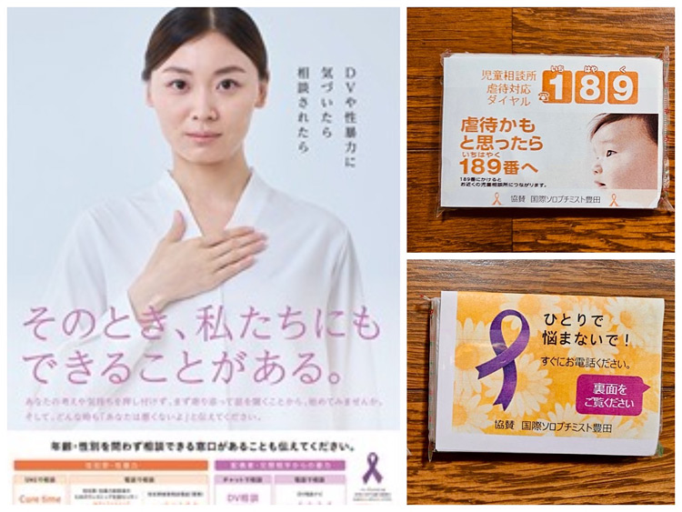 ソロプチミスト豊田は継続事業として、キラッ☆とよた(豊田市ジェンダー平等推進センター)のご協力で、産業文化センター2階にブースを設け、また、産業文化センター女性トイレ・受付、市役所受付(こども相談課・よりそい支援課・市民相談課)に「ホットラインカード」を入れたポケットティッシュを置き啓発活動をしています。