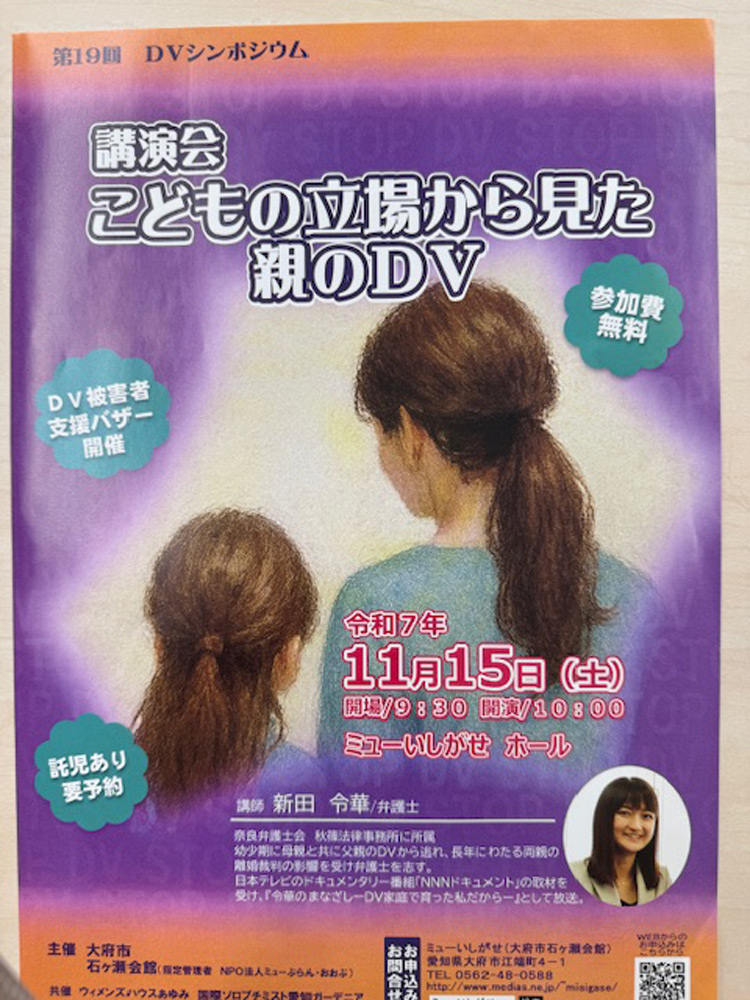 令和7年11月12日~11月25日「女性に対する暴力をなくす運動」内閣府男女共同推進連携より通達。大府市石ケ会館に於いて、11月15日DVシンポジュウムが開催され、当クラブは協賛・参加いたしました。今年は「子供の立場から見た親のDV」講師は新田麗華弁護士。新田さんの体験談より、DVを受けた母親はPTSD・鬱症状になり、5歳の時母親と共に父親のDVから逃れ祖父母の家に身を寄せた。その後母と2人の生活で母と喧嘩、登校拒否、家出など、しかし長年にわたる両親の離婚裁判の影響を受け弁護士を志した。DVは、子供の成長にとって大切な安全・安心を根底から壊してしまいます。そして子供の心や体に様々な影響を与えると言われています。11歳から13歳はダメージが大きいと言われています。(新田令華弁護士講演より)