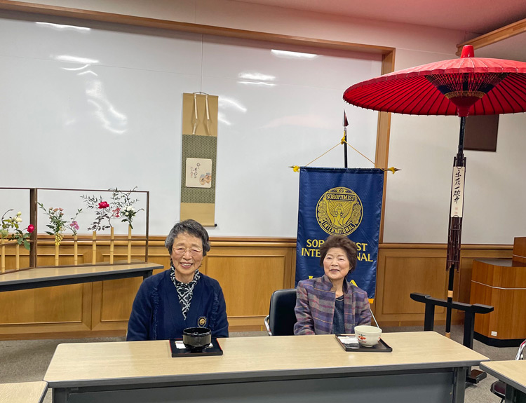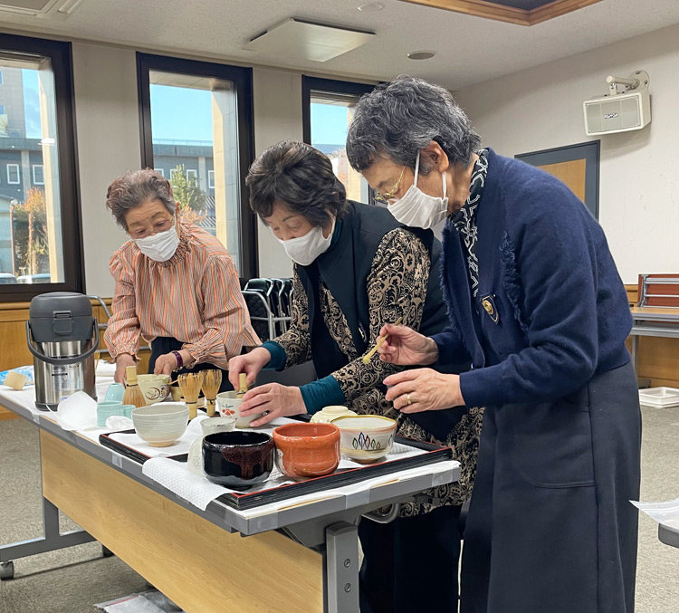 11月の卓話は11月26日の例会後に会員の親睦を深めるためと題しミニお茶会を試みました。奉仕プログラム委員会が中心となり行いましたが会員のご家族の協力もあり殺風景な例会会場が素敵なお茶室となり心和む空間に様変わり致しました。このような雰囲気のなか会員の茶人3名がお茶を点て美味しいお菓子とともに二服頂きその後はそれぞれ教わりながら会員自らがお茶を点ていただきました。