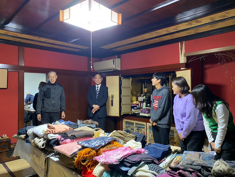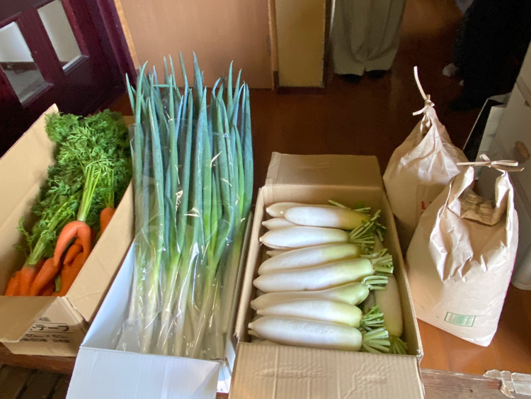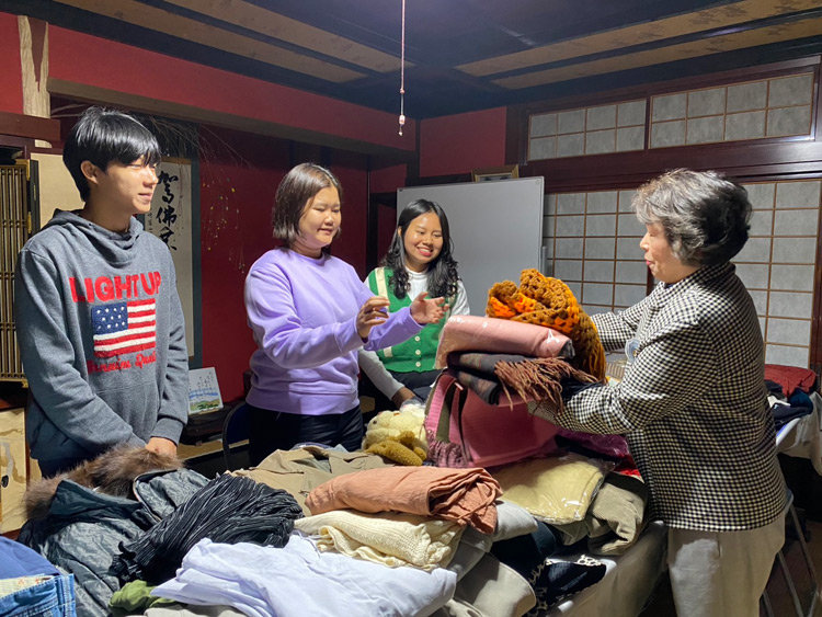 2019年より、故郷の生活環境と違う日本の寒い冬を過ごす為に少しでも温かく過ごせるように会員やその家族・友人からお預かりしました冬物衣料を支援しています。今年は衣料300点、また自炊する生徒さんにお米や新鮮な野菜等(大根、人参、ネギ等)少しでもお役に立てれば・・・と気持ちを込めて、贈呈致しました。