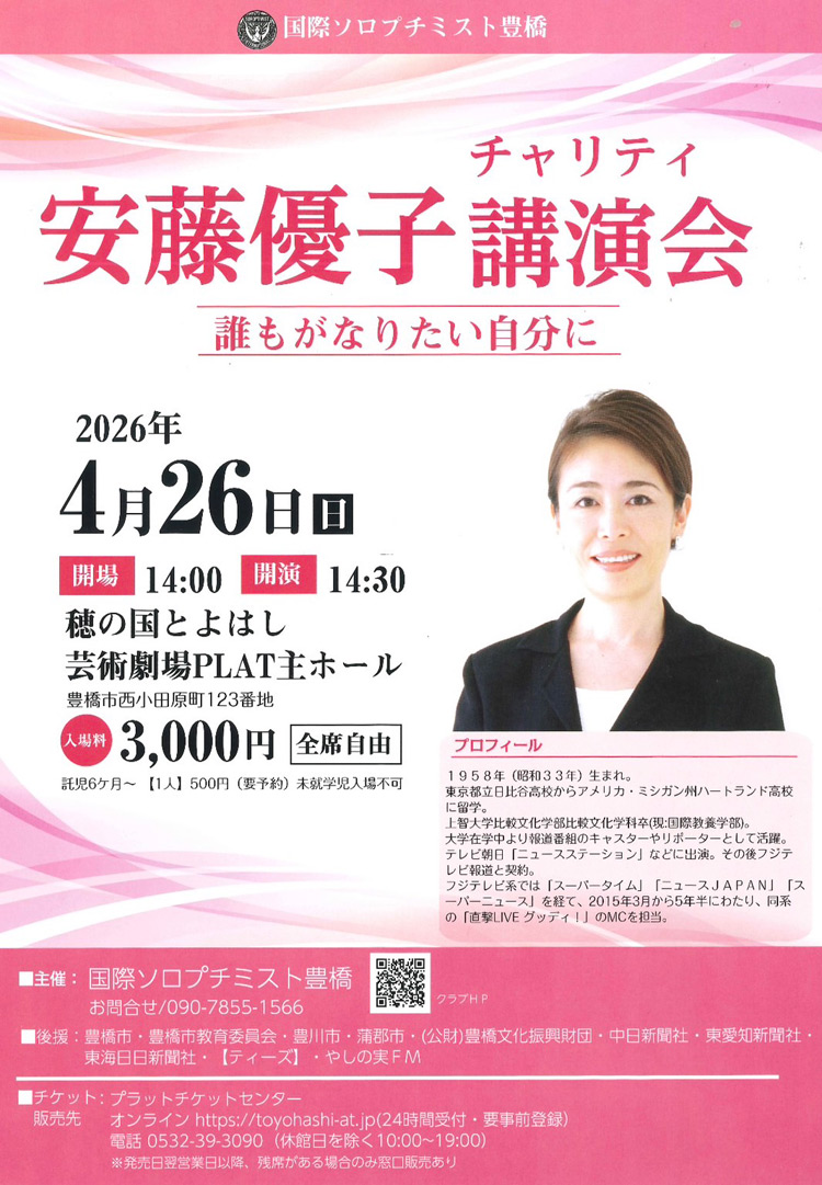 | 内容 | : | 恒例のクラブ催事が決定です! 今年度は、テレビ等でご活躍されている『安藤優子さん』をお迎えいたします。